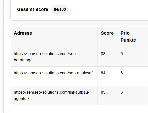 Egal ob du einzelne Seiten optimieren oder eine komplette Website analysieren möchtest – das Tool hilft dir dabei, SEO-Potenziale schnell zu erkennen, klare Prioritäten zu setzen und Optimierungen effizient umzusetzen.