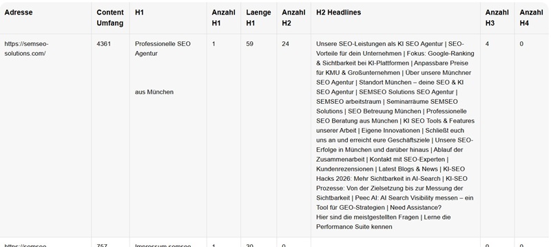 Gerade bei größeren Projekten, Online-Shops oder Content-Websites sparst du damit erheblich Zeit und erhältst gleichzeitig eine klare Übersicht über alle relevanten SEO-Faktoren. Von Meta-Daten über Content-Struktur bis hin zur internen Verlinkung und technischen Aspekten liefert dir das Tool alle wichtigen Informationen auf einen Blick.